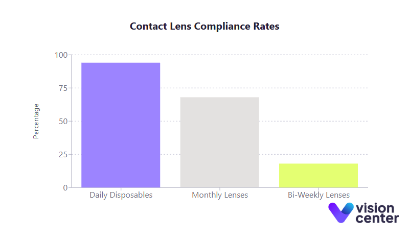 - Daily disposables show the highest compliance rates (around 94%), mainly because they eliminate nightly cleaning.
