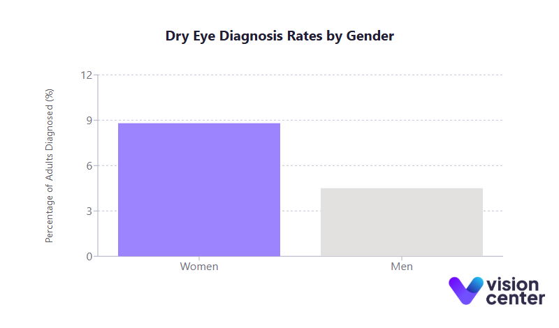 - Women develop dry eye syndrome at nearly twice the rate of men, with the disparity becoming especially pronounced after menopause.